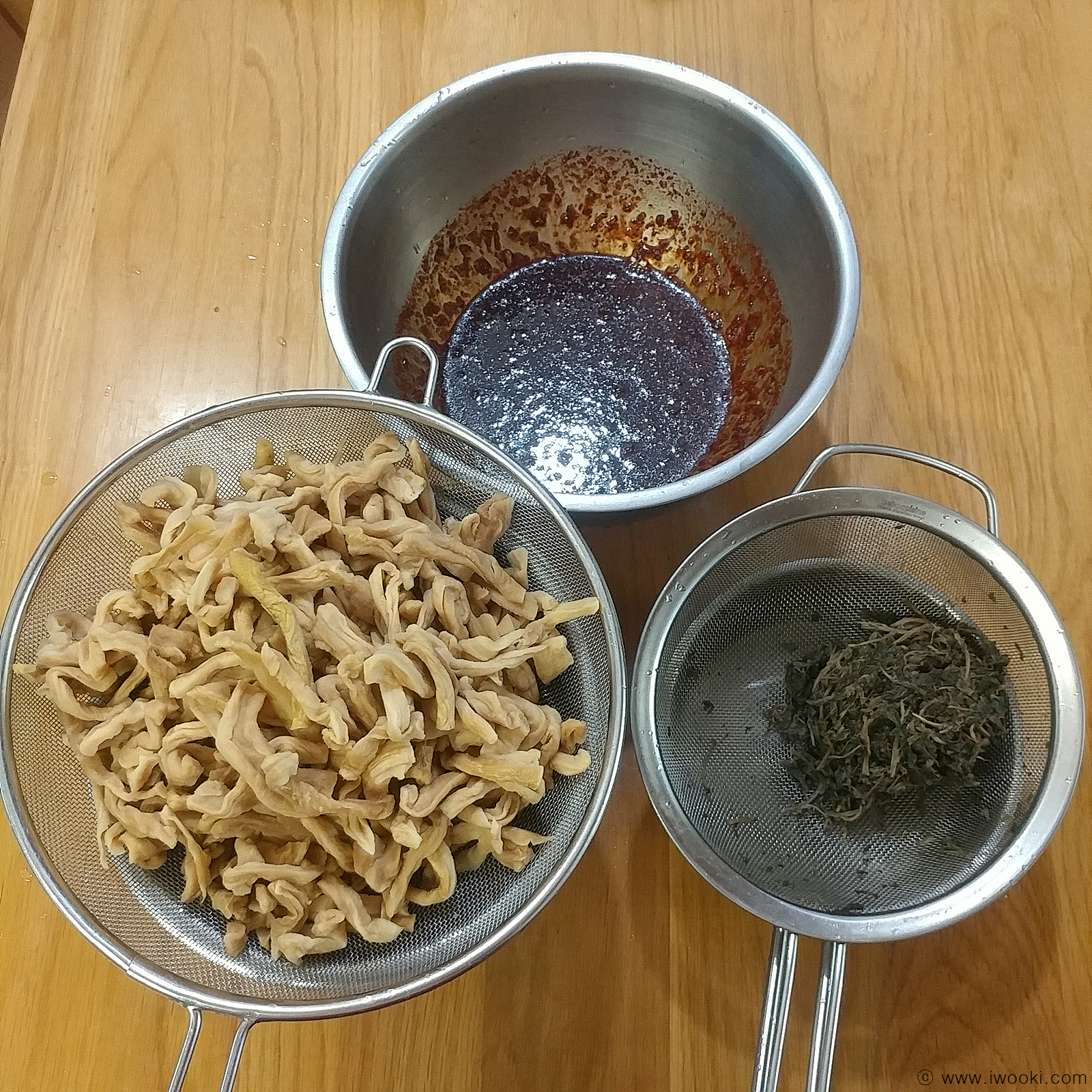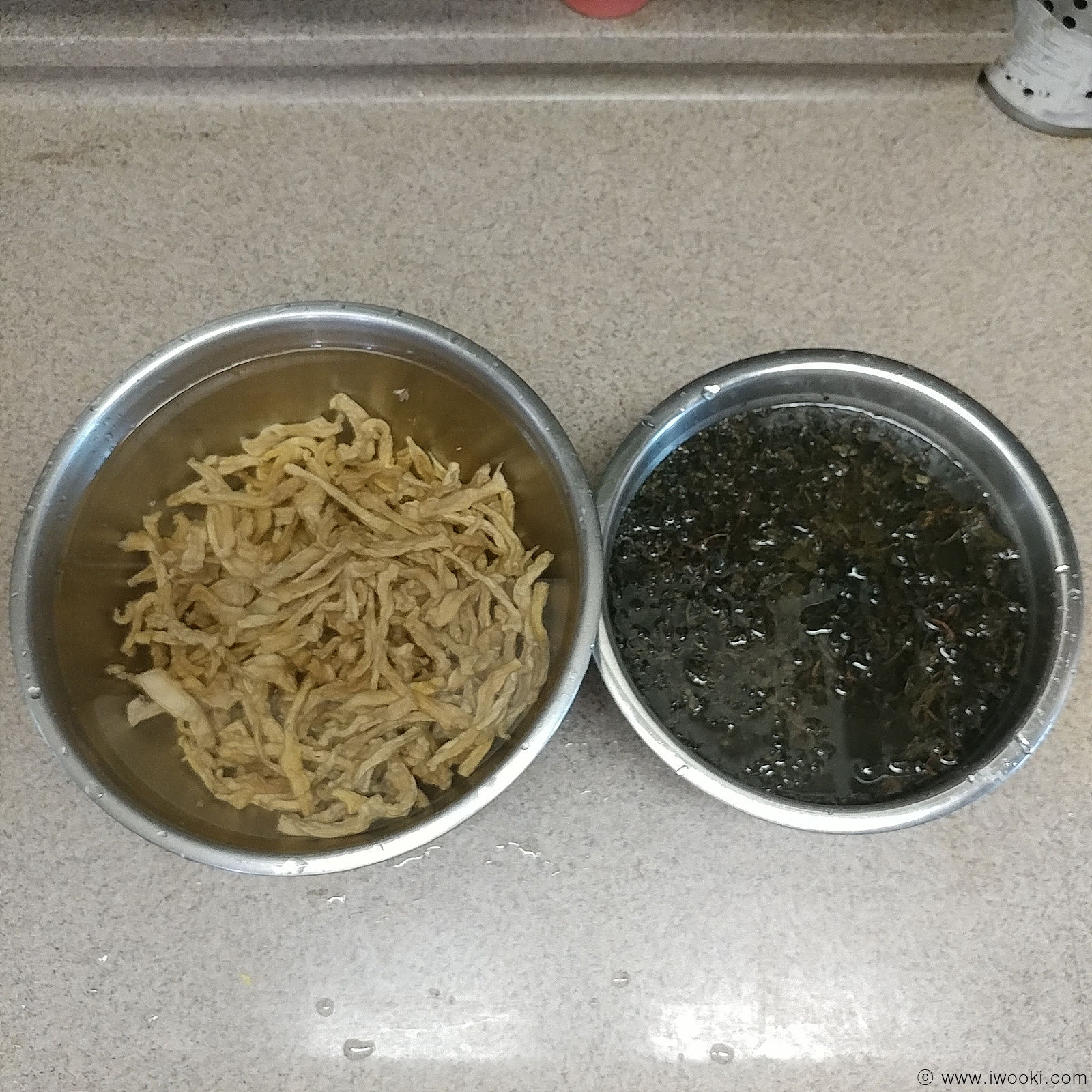 2. 무말랭이(250G) 30분 정도 불리기 (쌀 뜬물에 불리면 매운 맛 사라짐), 고춧잎 20을 20분 정도 불린다음 끊는 물에 데쳐서 준비,