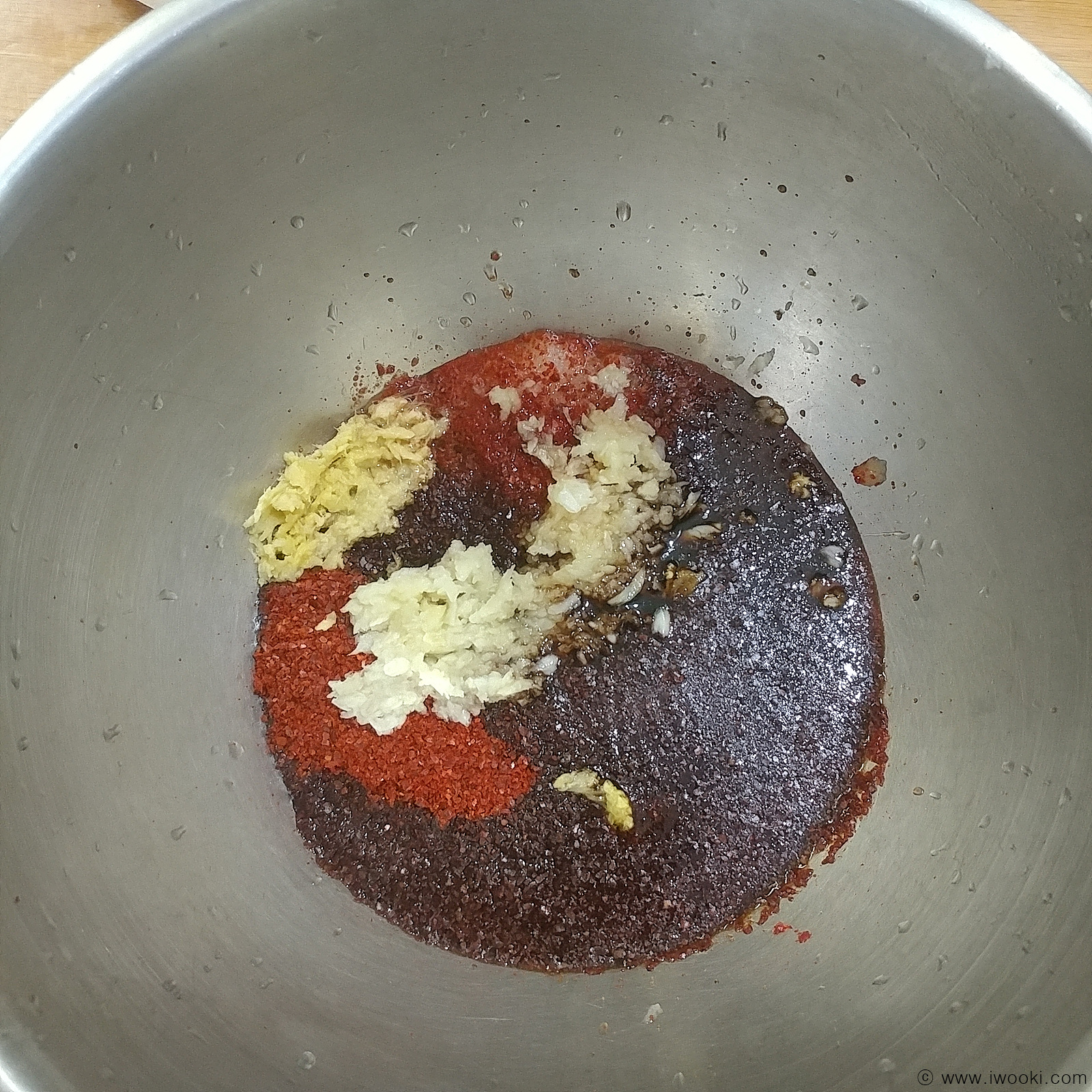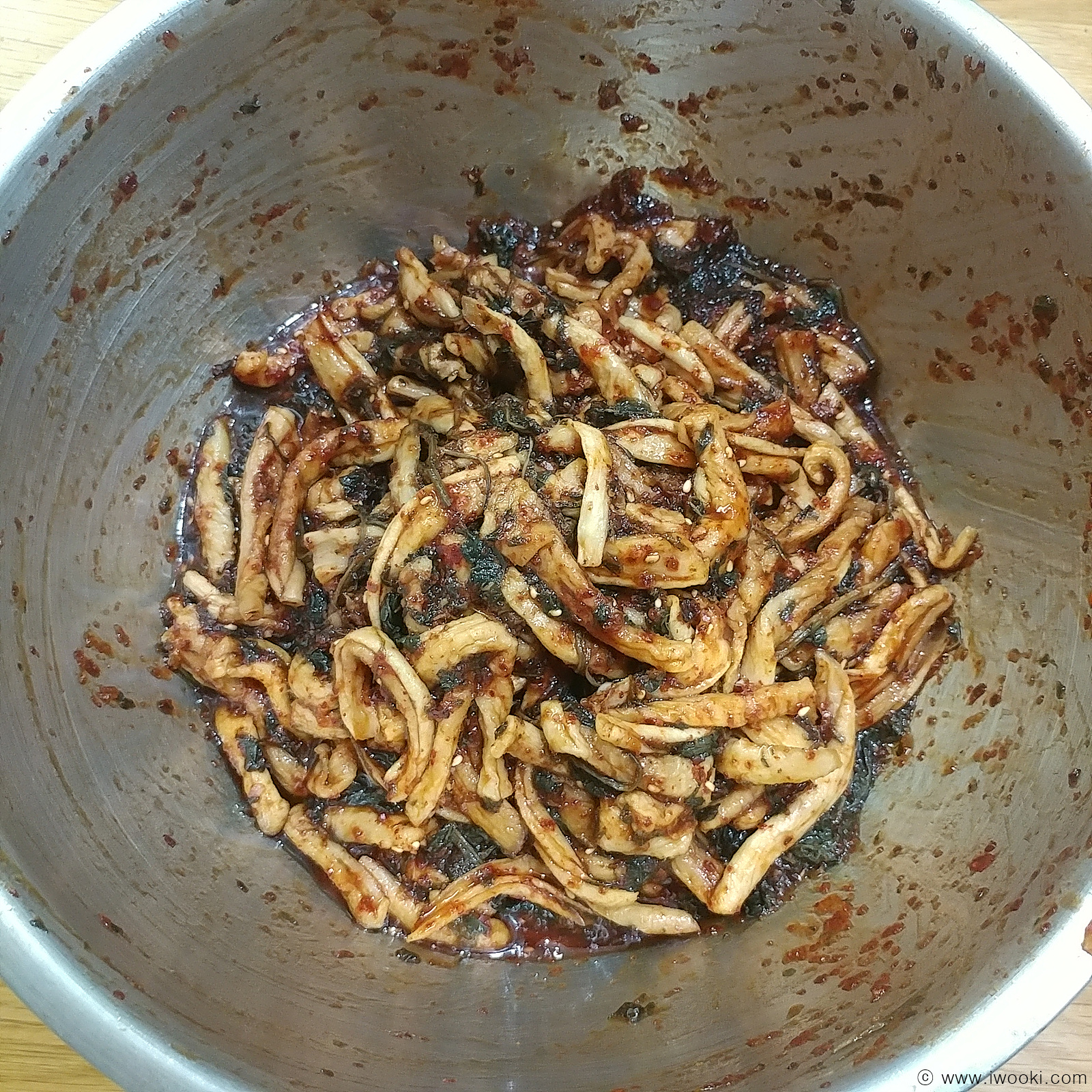 5. 양념장 : 쌀조청 200g, 굵은 고춧가루 40g, 멸치액젓 50g, 진간장 50g, 배즙 20g, 다진마늘 20g, 다진생강 20g, 소금 2g, 무즙 30g, 찹쌀죽