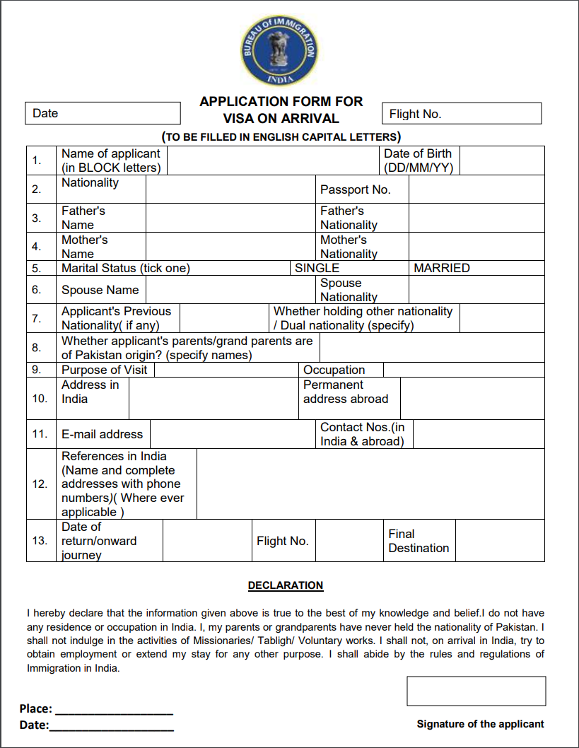 - 아래의 인도 도착비자 양식을 출국전 미리 다운로드해서 형식에 맞게 빈칸 채워 인쇄해 놓는다. (인도내 주소는 적당한 숙소를 검색해서 채우면 된다. 12번은 비워두어도 상관없다).