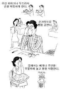 (3) 조용히 눈을 감고 손바닥을 눈앞에서 가볍게 굽힌 다음, 새끼손가락 쪽이 코에 닿도록해서 손가락으로 이마를 가리듯이 가져다 댄다. 이때 주의할 일은 결코 안구에 압력을 가하지 않도록 하라는 것이다.