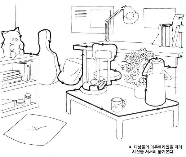 어떤 물체의 주위를 시계방향으로 시선을 움직이면서 그 주변의 선을 따라 그린다.