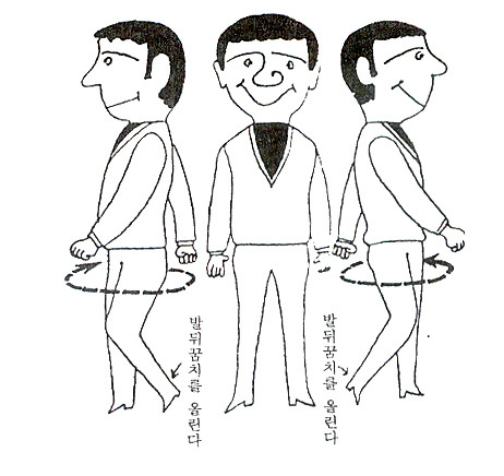 넷째 신체회전을 하는 것이다. 다리를 15cm 정도 벌리고 몸을 오른쪽으로 돌리고 동시에 왼쪽 발뒤꿈치를 뜨게 한다. 머리와 팔은 몸의 움직임에 수반한다. 다음에 그 반대로도 되풀이하여 16회 정도 반복한다.