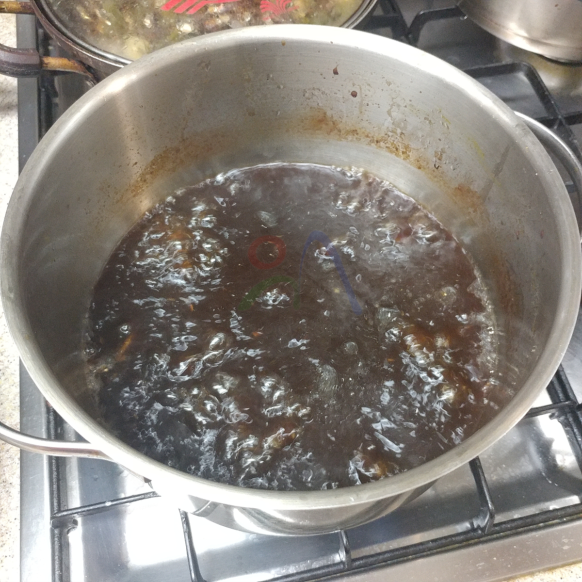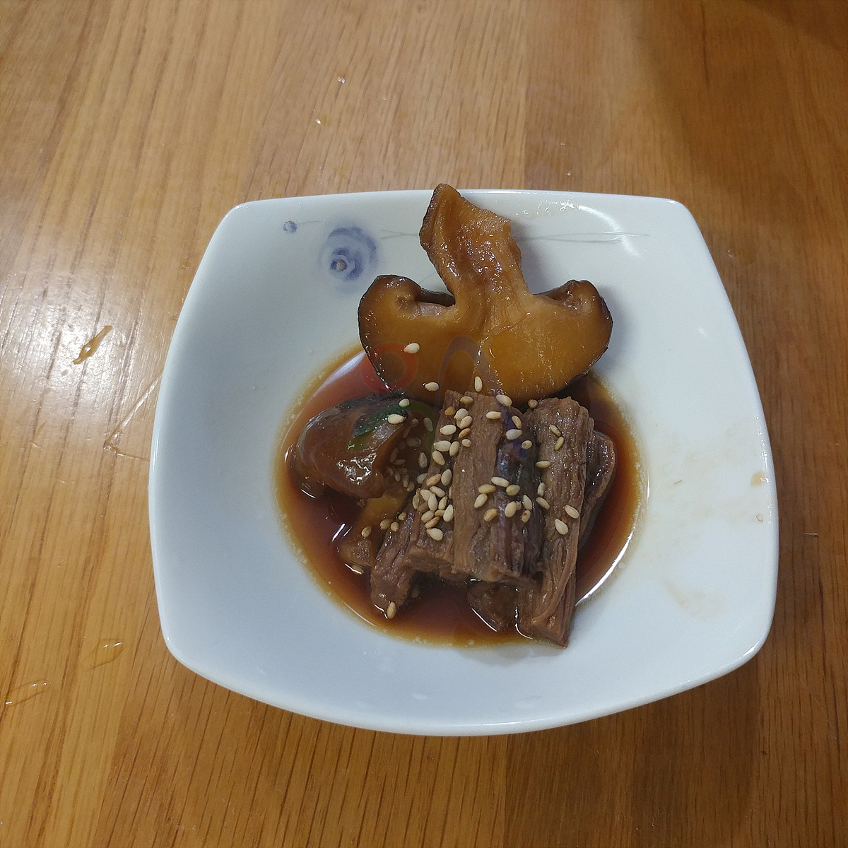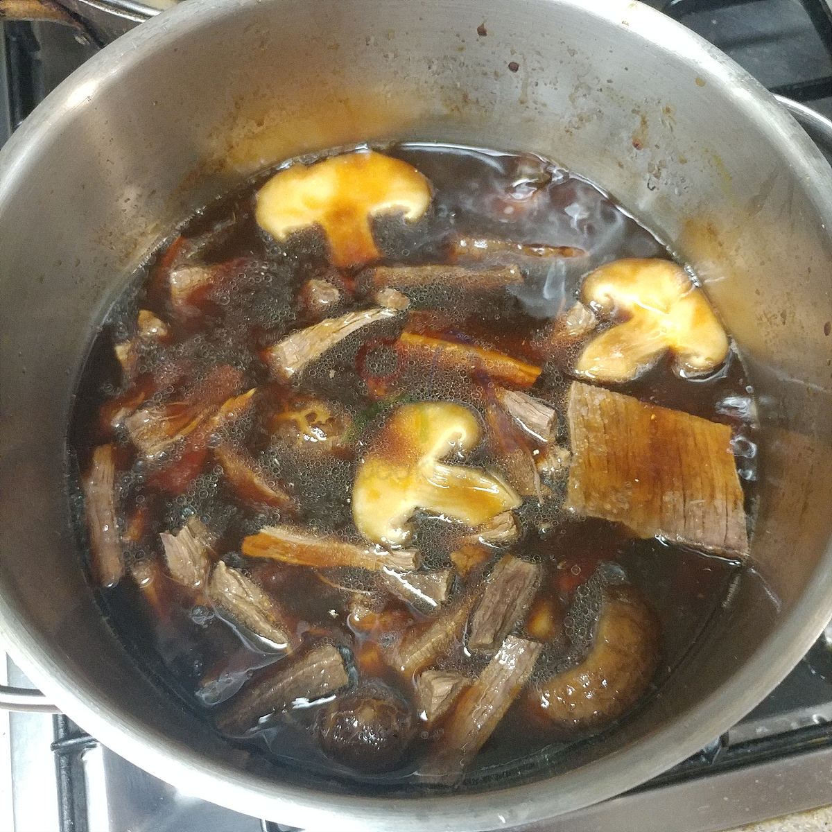 6. 육수에 조림장용 재료를 비율대로 넣고 끊어 오르면 쇠고기와 표고 넣고 5분 졸이기