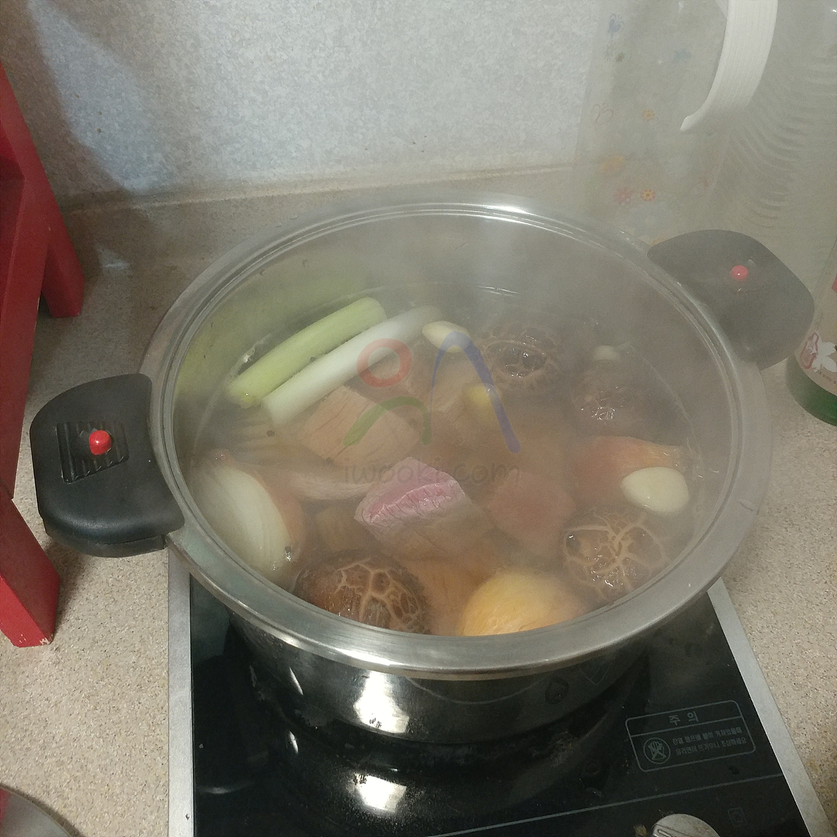 3. 물이 끊으면 쇠고기 넣고 뚜겅을 열어둔 채 10분 삶아 냄새 날리기