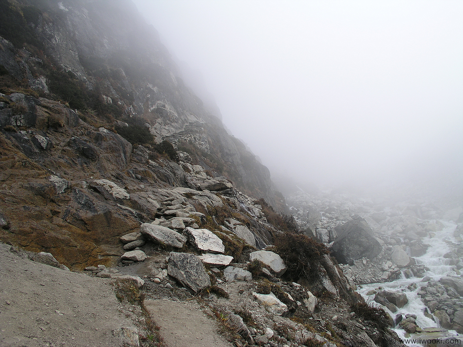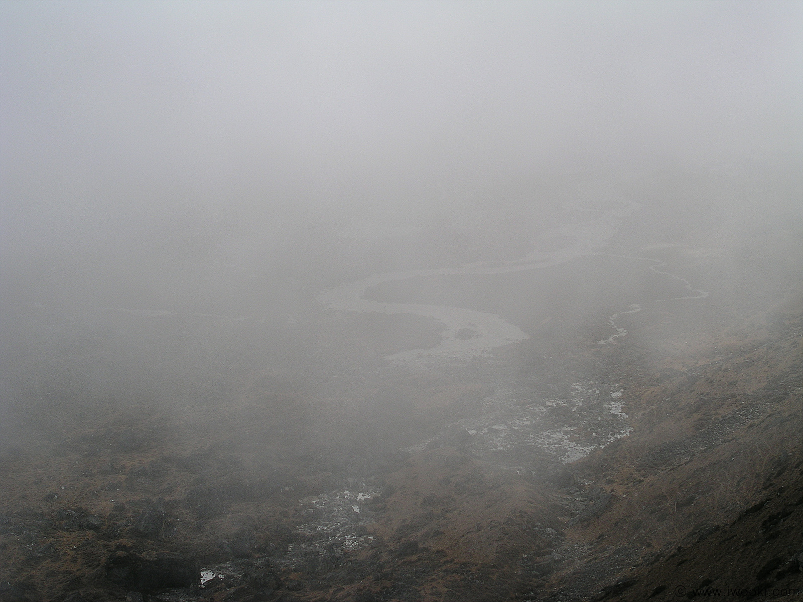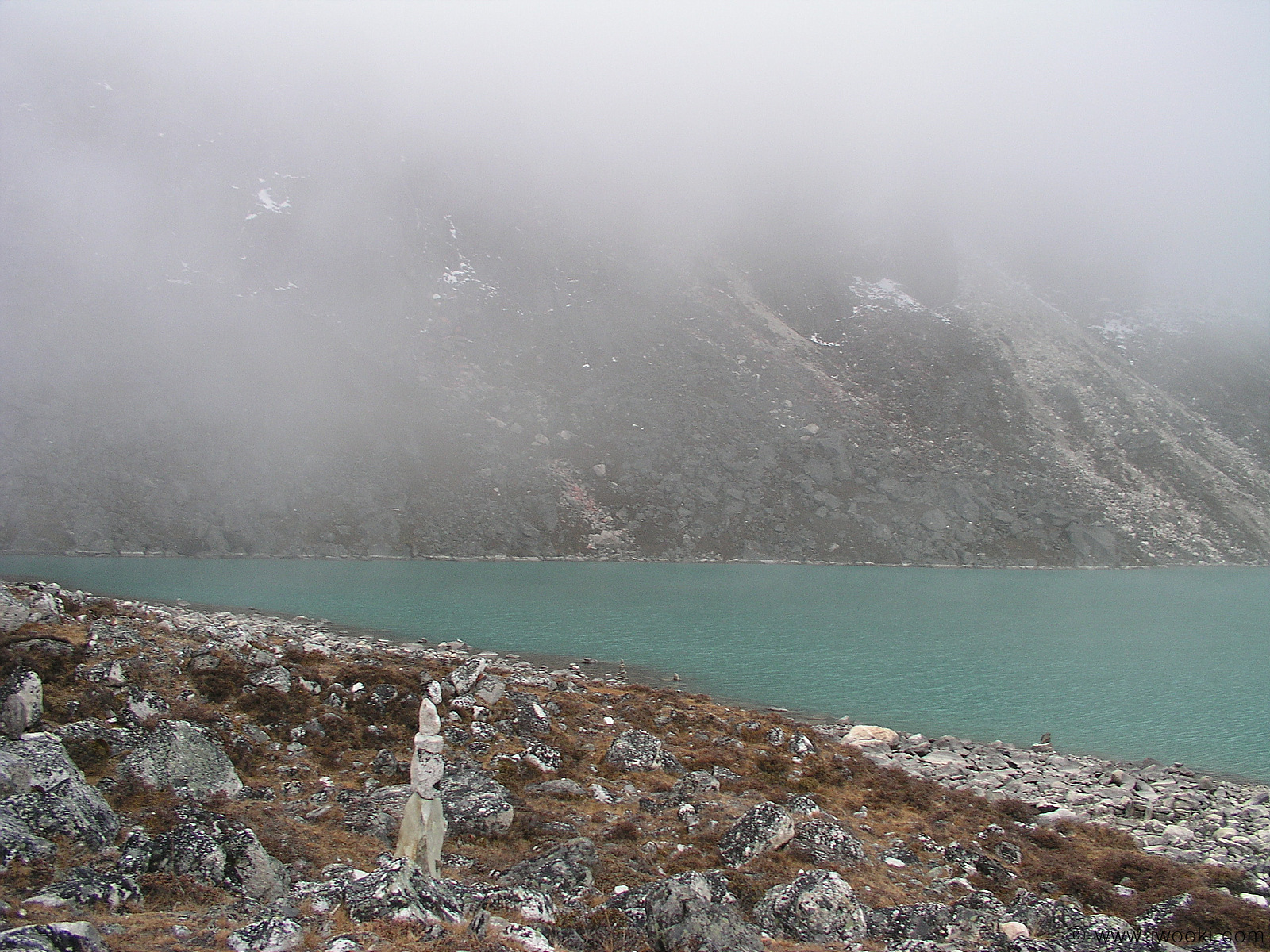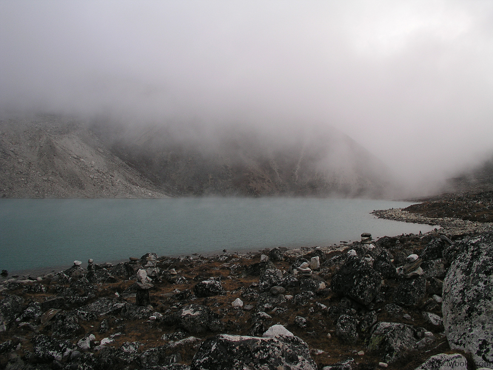 해발 5000m가 넘는 Gokyo의 호수와 짙게 낀 안개, 전날 너무 한꺼번에 고도를 올라 숨이 막혀 잠 한숨 자지 못하다.
