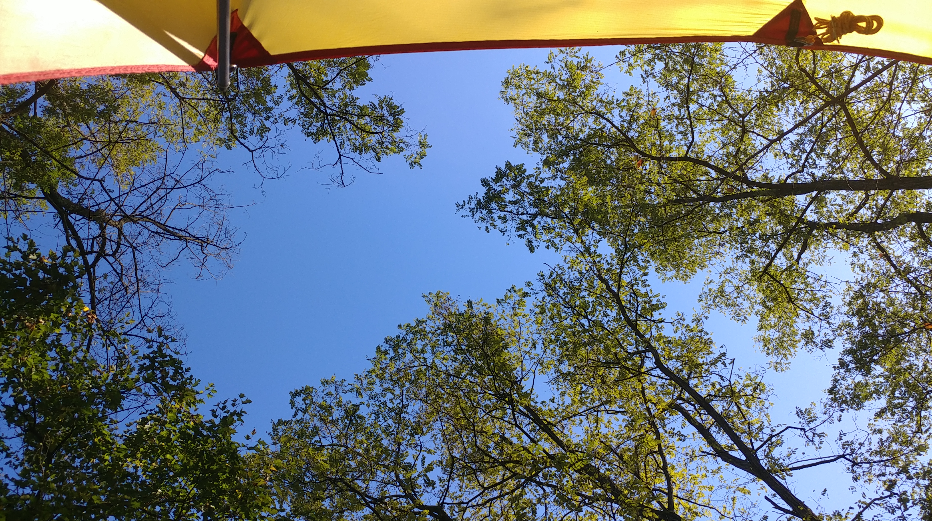 바람에 춤추는 나뭇잎 사이로 파란 하늘