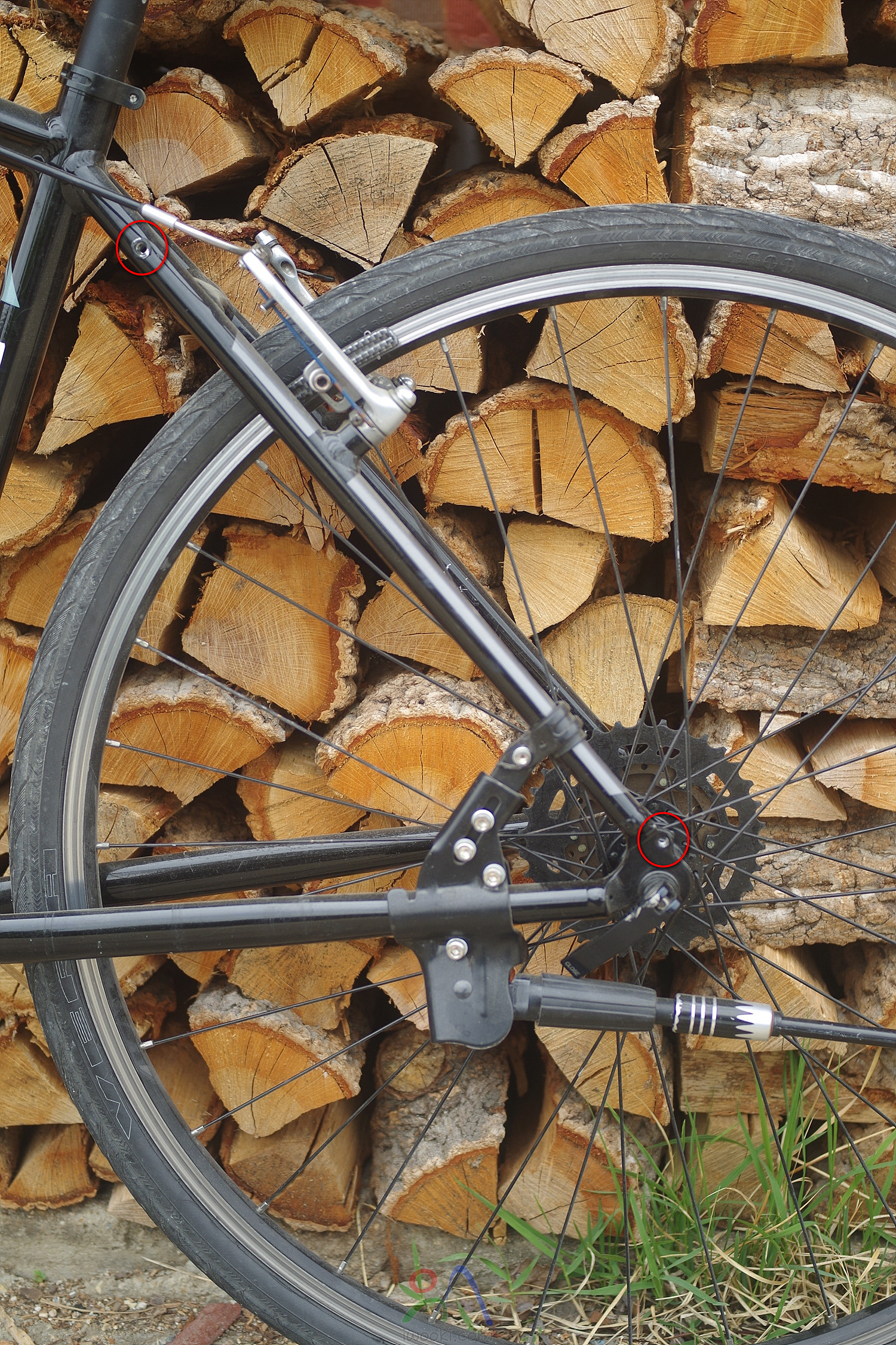 이처럼 시트튜브에 가까운 위 쪽 아일렛(Eye-let)이 없어도 아래쪽 허브근처에 아일렛(Eye-let)이 있으면 비교적 어렵지 않게, 안정적으로 해결가능합니다.