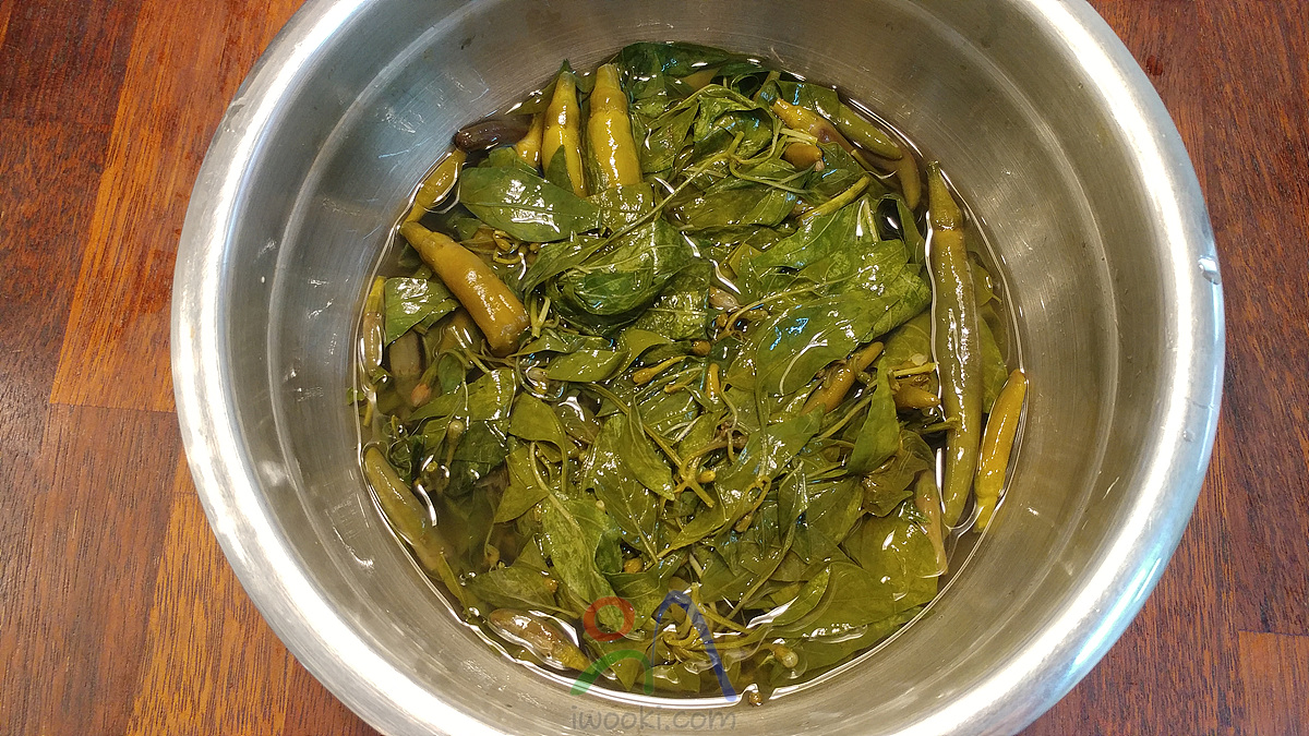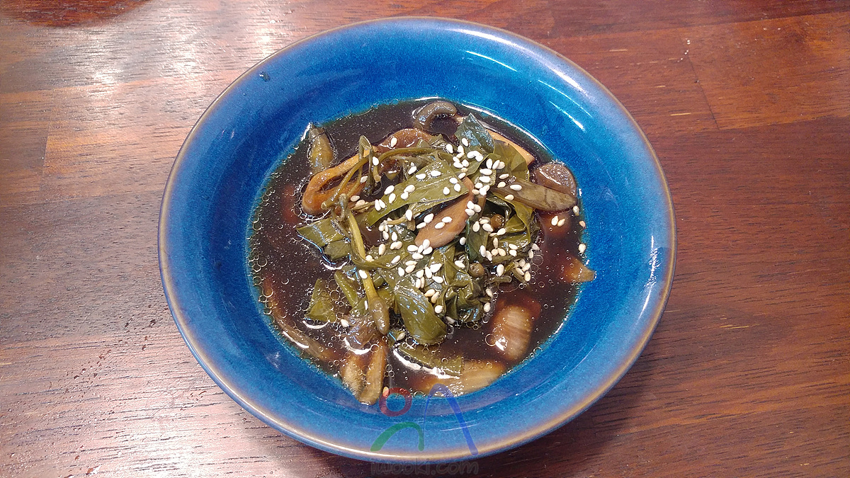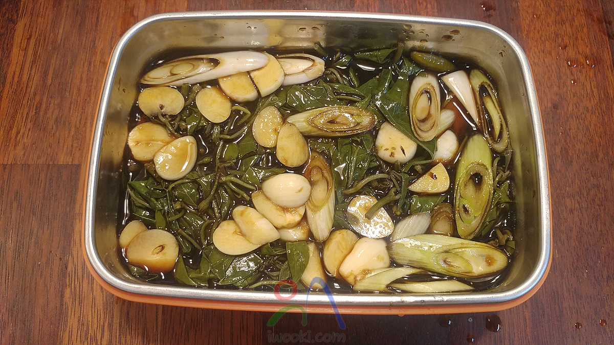 양념장 (진간장:액젓:매실엑기스=4:4:1, 너무 간장이 짜다 싶으면 육수로 희석) 비율로 배합 자박하게 잠길 정도로 부어주고 무거운 돌로 눌러주기