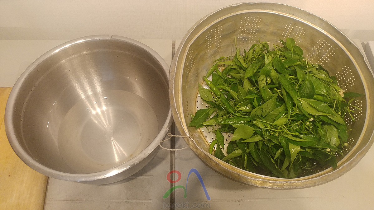 텃밭에서 고추잎과 덜 자란 고추, 꽃 수확