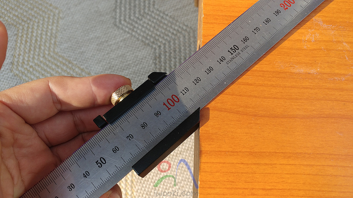 일반적으로 사용하는 쇠자에 연결하여 직각이나 45도 마킹하는 게이지 도구입니다.