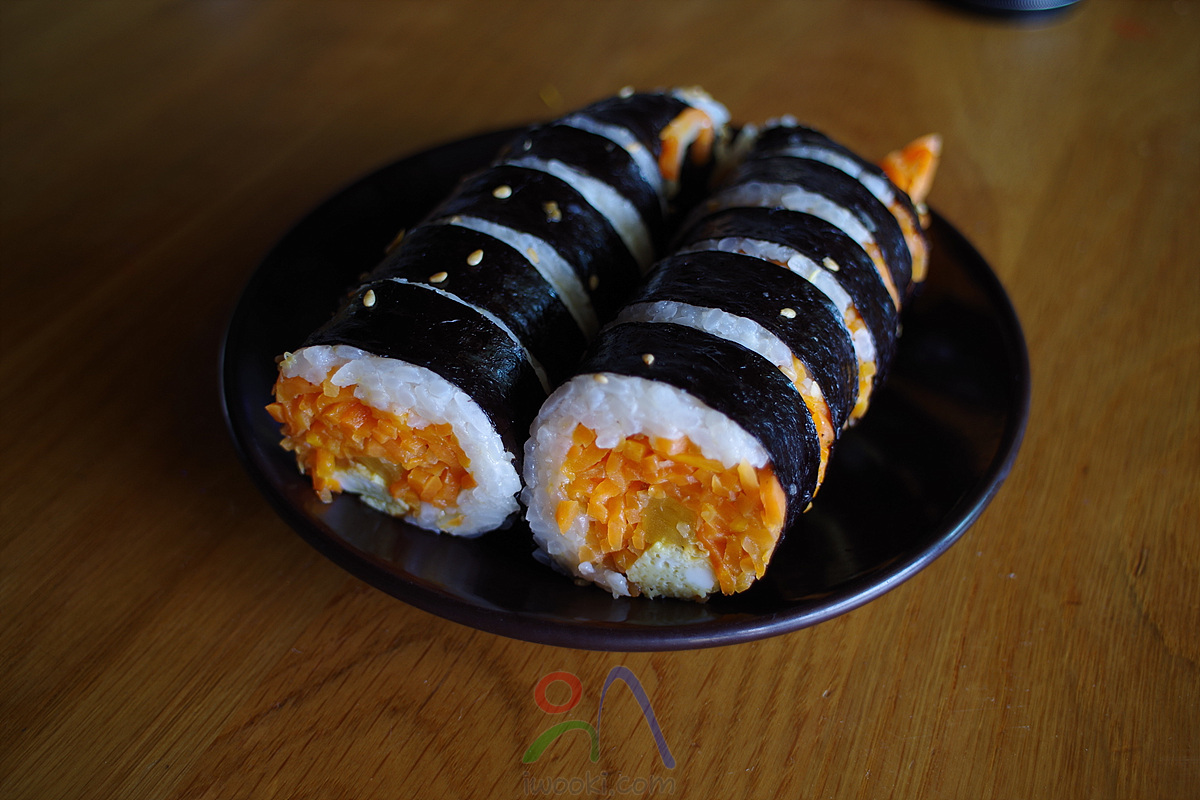 그런데, 신기하게도 듬뿍 넣은 당근의 오묘한 맛이 일반적인 김밥과 차별됨.