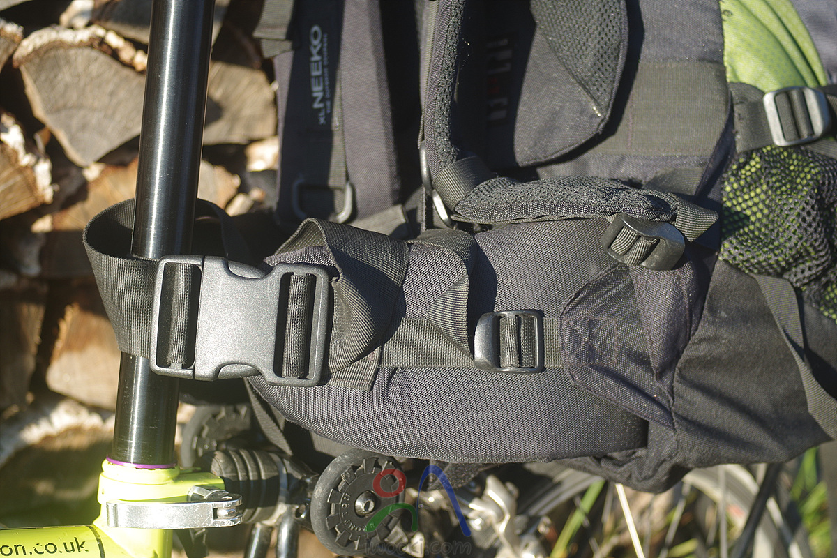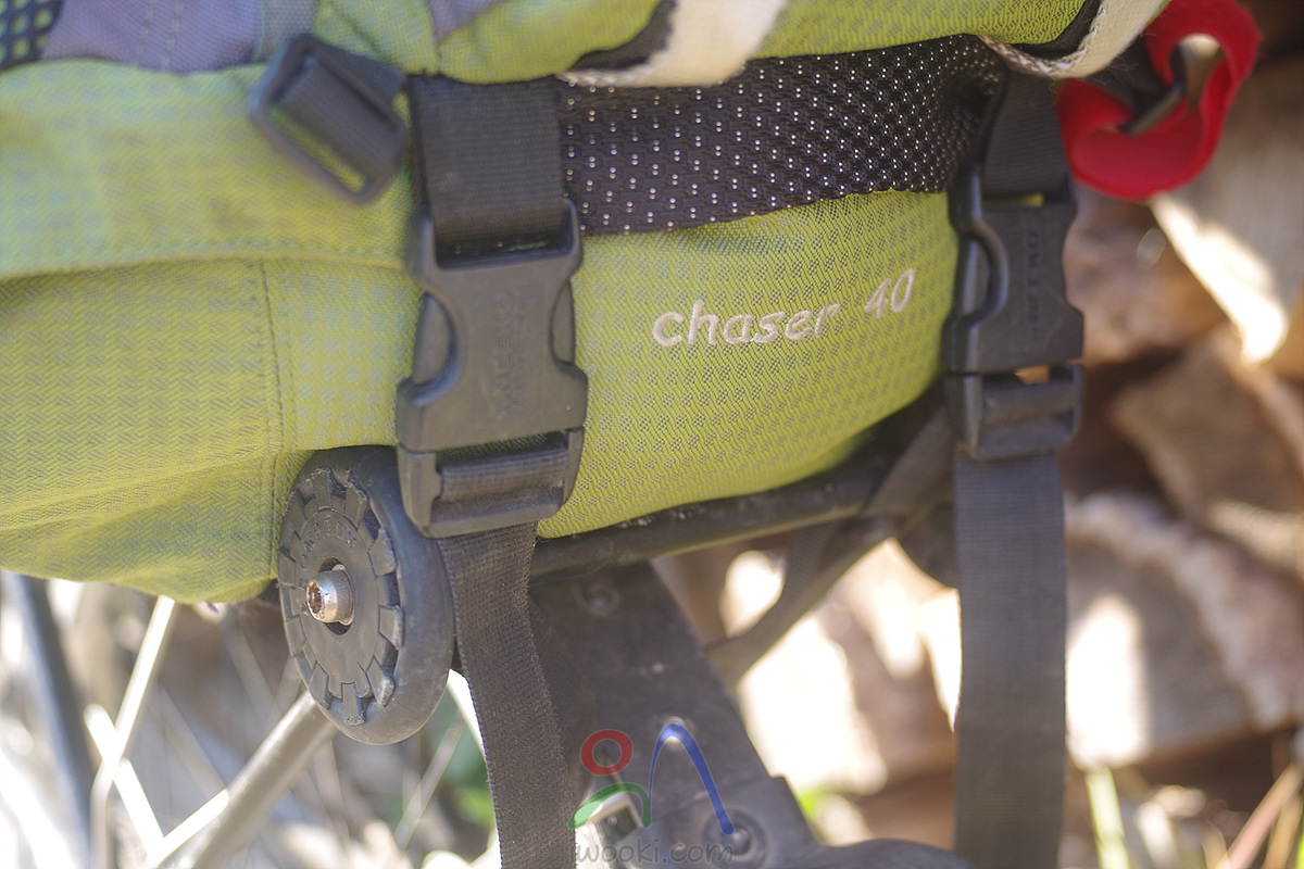 배낭 앞판 하단에 하부수납끈을 이용하여 짐받이 뒤쪽과 체결해 줍니다.