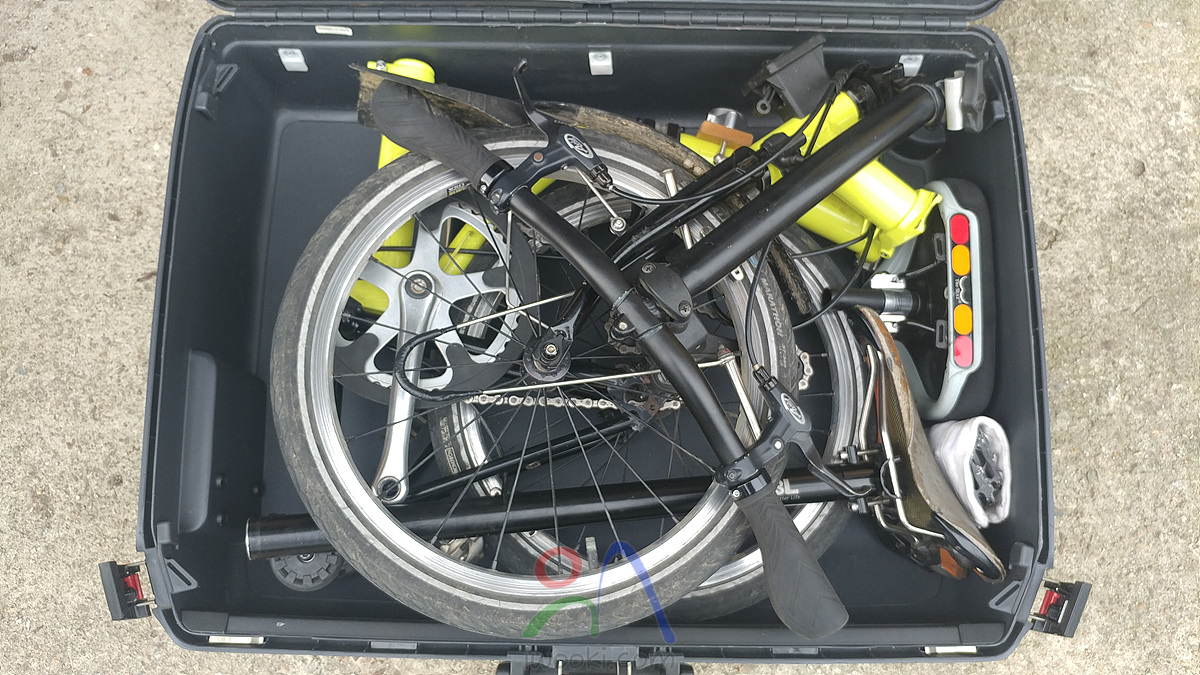 브롬톤은 바퀴 안 떼고 싯포스트와 짐받이 정도 떼어내면 무리없이 들어가고도 공간이 남아 여행장비 넣을 수 있는 방면