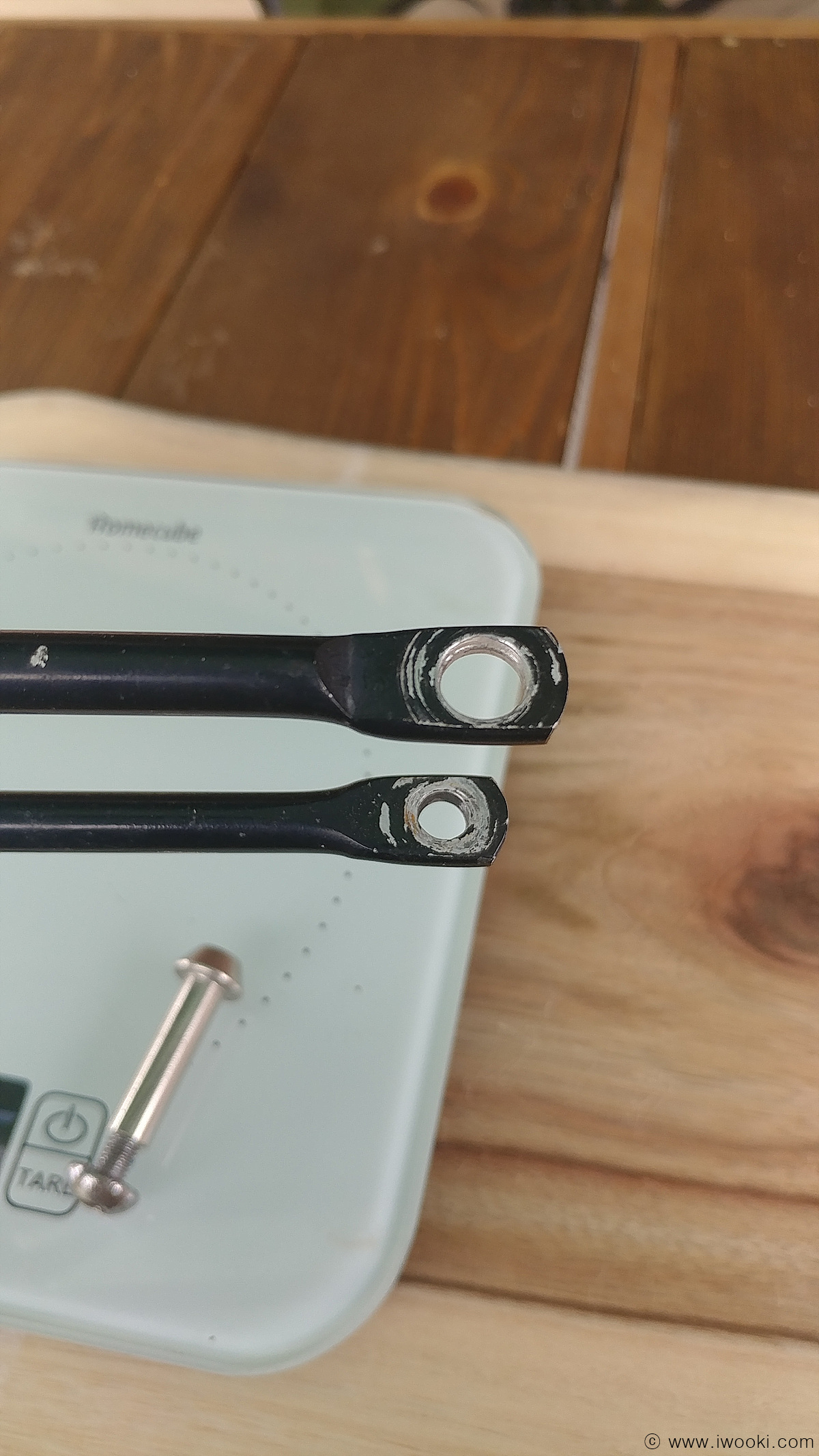 짐받이의 폴대 한 쪽을 8mm 드릴로 구멍을 확대해 줍니다.