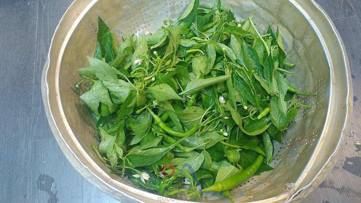 텃밭에서 고추잎과 덜 자란 고추, 꽃 수확